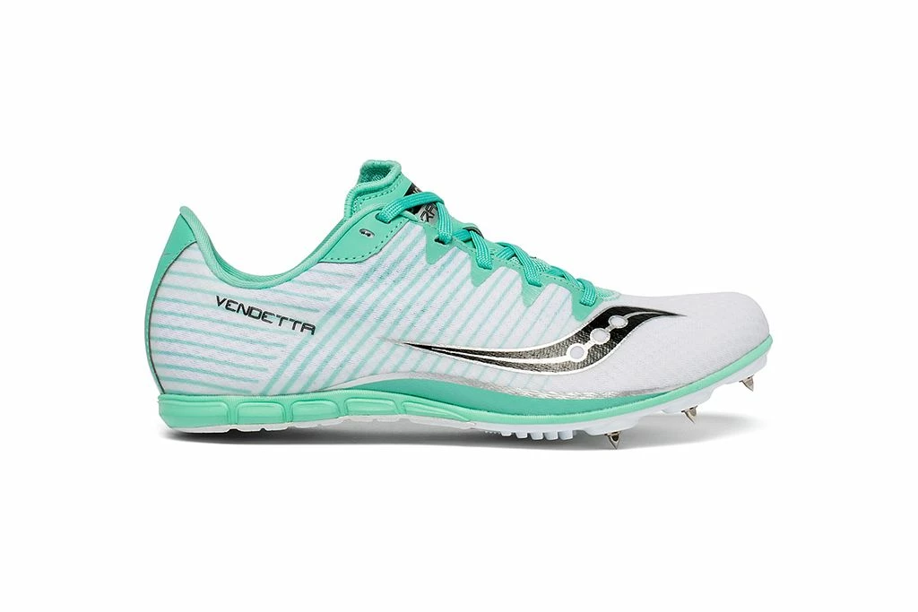 A highly versatile entry-level spike for the middle distance runner, the Saucony Vendetta 2 makes dropping times personal. Its responsive design and six-pin spike plate have the spring and the grip to have you flying around the track in events from the 400m to the 3200m. A lightweight, breathable mesh upper wraps the foot comfortably, while carbon rubber in the heel offers added durability.